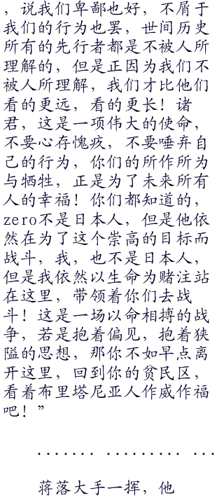 “我与诸君已经许久没有一起行动了,希望这一次,我们的战斗依然能够成功,这是我的愿望,也是zero的愿望!”