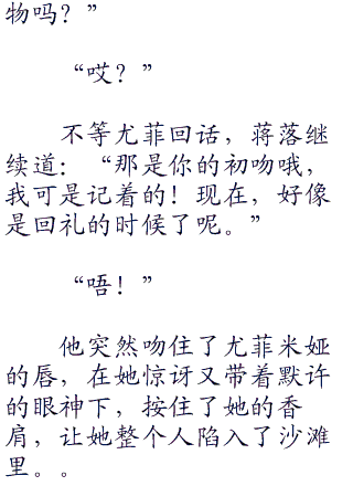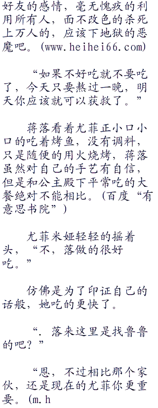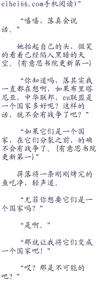尤菲米娅笑着说道,她看着面前的篝火,看着他用削尖的树枝打的鱼,看着他不知从哪里弄来的淡水,即使这些东西很难吃,但是尤菲却从心中升起了淡淡的幸福。