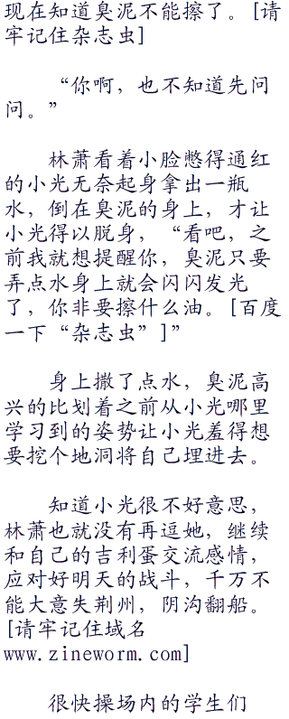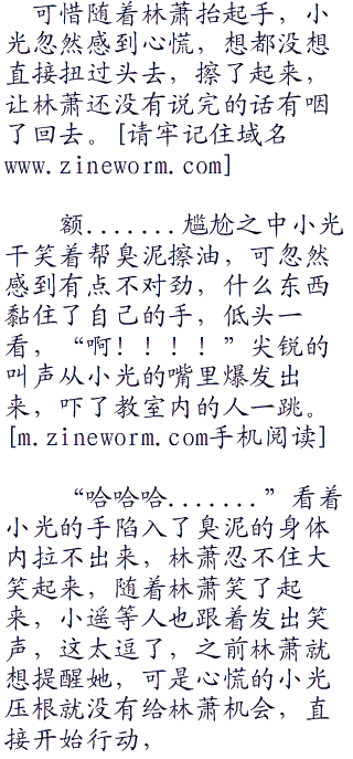 林萧看到小光想帮臭泥擦油,抬起手,想告诉小光臭泥不能擦,因为你只要撒一点水它的外表就很光亮,如果你碰它的话,你的手会陷入它的体内。