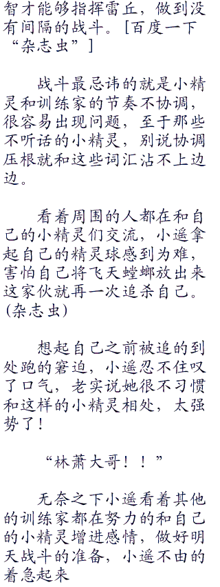 这么做能够强训练家和小精灵的感情快速的增加,更好相处,小智这一点做的不错,懂的先询问一下小刚了,虽然对皮卡丘很熟悉,但是小智对于雷丘这皮卡丘的进化型小精灵可是一点都没辙,而且林萧看出来了,小智得到的这只皮卡丘比较害羞,性格内向,需要多多相处才能让雷丘相信小智。