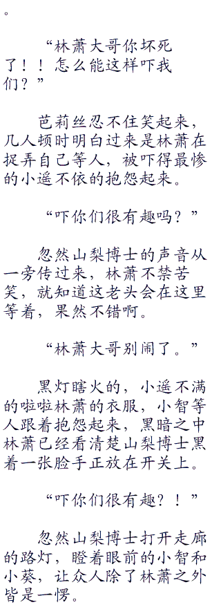 和林萧一起旅行被吓过的小遥立刻起了一身的鸡皮疙瘩,感觉自己的毫毛都立了起来。