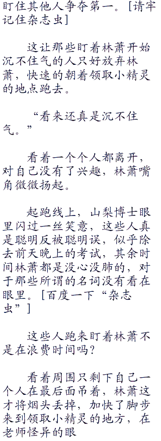 离开了起跑线林萧依旧不慌不忙的朝着领取小精灵的地点走去,这下那些盯着林萧的人开始不耐烦了,认为这是林萧的计划,让自己被