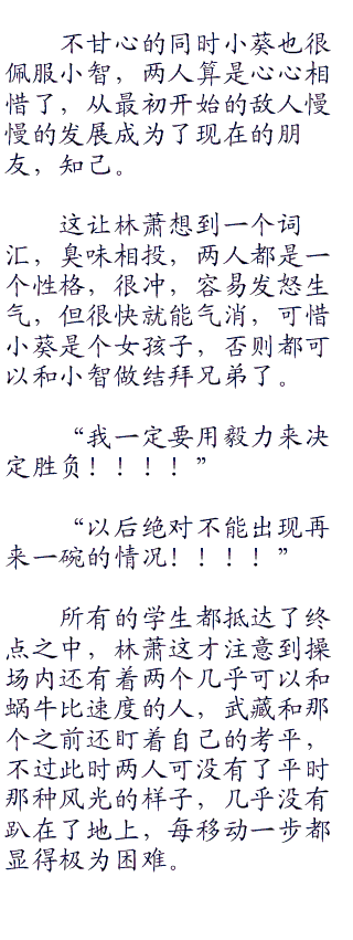 慢慢的林萧逐渐超越过了不少学生,很快和小遥三人回合。