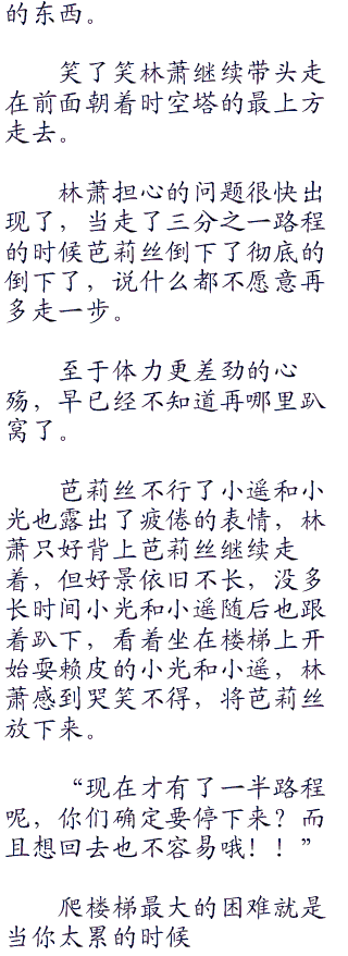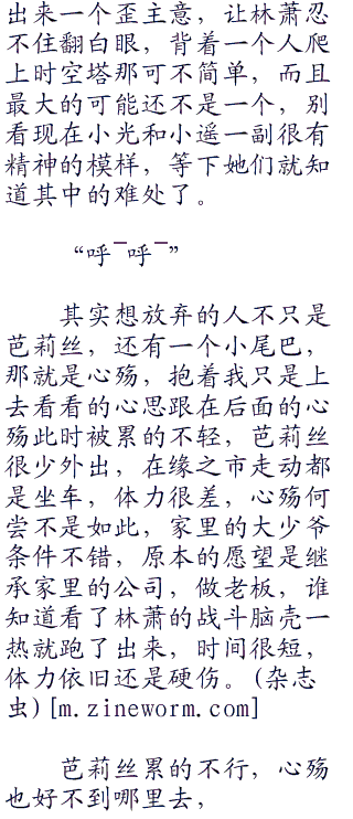 相比起来还是芭莉丝比较理智,体力最差劲的她感觉有些喘息了,看了看头顶上还是一望无际的铁楼梯,感觉头皮有些发麻,这才一会呢就累成了,继续下去还得了?