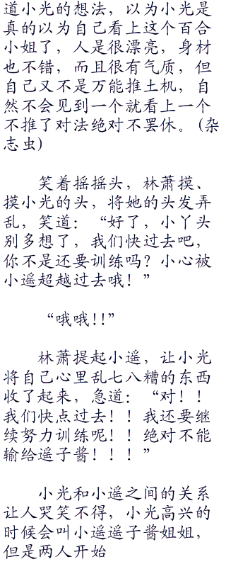 小光捏捏自己的脸蛋,在看看自己的身子,似乎是除了可爱一无是处了........这让高兴的小光一下子变得沮丧起来。