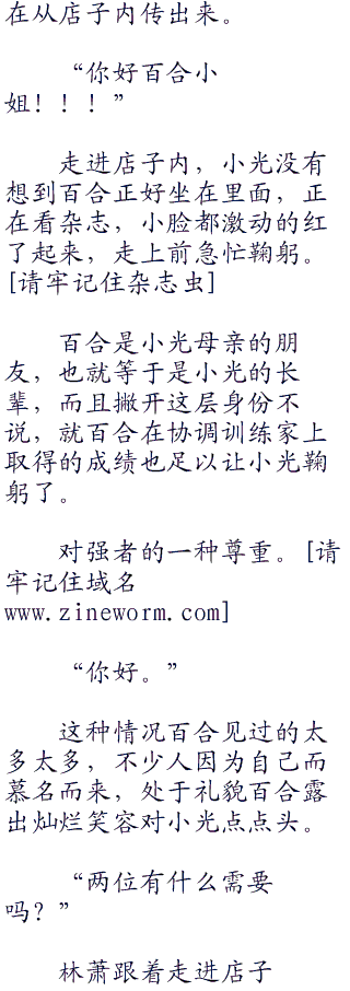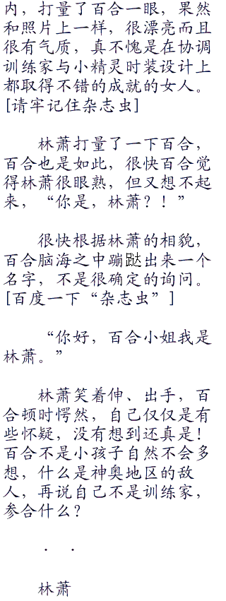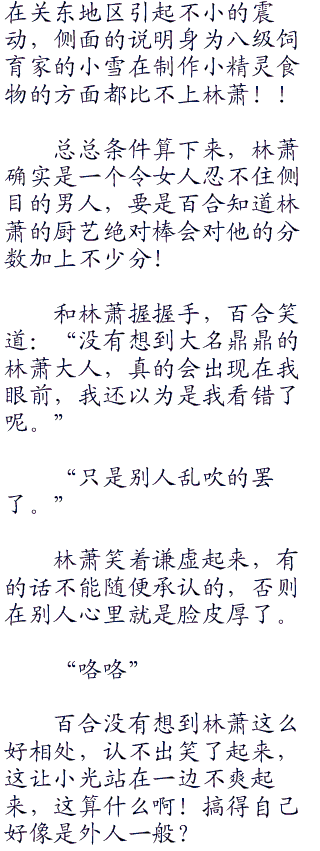 发现自己想歪了,林萧轻咳一声,让小光抿嘴一笑,眯起漂亮的眼睛,故意的拉长了声音,“嘿嘿,林萧大哥是不是被百合小姐的美貌给迷住了?”