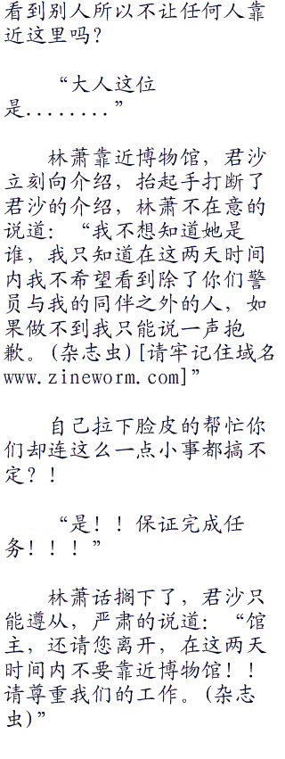 “那我们就出发吧,将博物馆的资料给我一份,然后让一些闲杂人等离开,在这两天时间内我不希望看到除了我和我的同伴以及警员之外的人,明白了?”