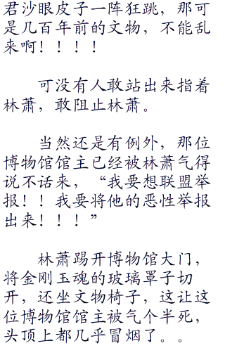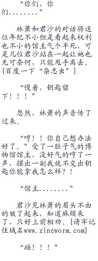 当卓文等人来到博物馆后,一个岁数不小,满头白发的老婆婆对着之前前行离开的君沙大吼了起来。
