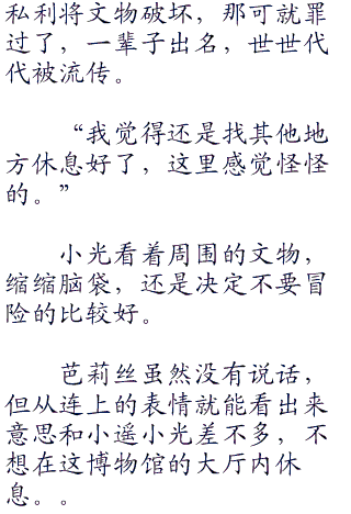 看着博物馆馆主远去,小光张张嘴,真想大声告诉她自己不是故意的,只是被逗得不小心笑出来声来了,没有嘲笑她的意思。