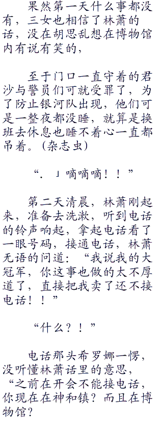 “哈哈,你们真逗,博物馆内有员工的休息房间你们不知道吗?我们直接在里面休息就好,只要保证宝物不丢就行,看你们急的。”