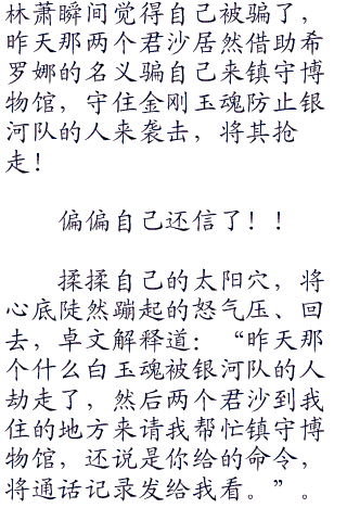 小遥和小光不满的大喊一声,自己这里吓得小心脏噗通噗通狂跳,可居然是开玩笑的,要不是怕嬉闹打坏宝物,小遥和小光真想扑上来咬林萧几口。