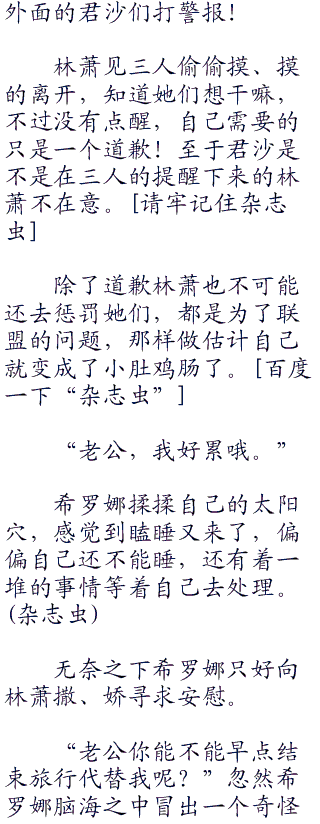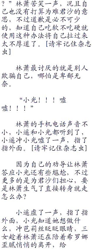 开始很生气,可转而一想林萧就释怀了,不是他很大气,而可以看得出来这些君沙是被逼急了,否则也不会这样请自己帮忙,简直就是骗!!!