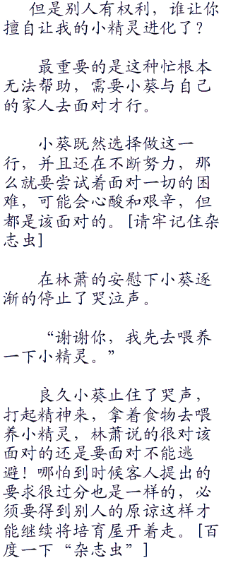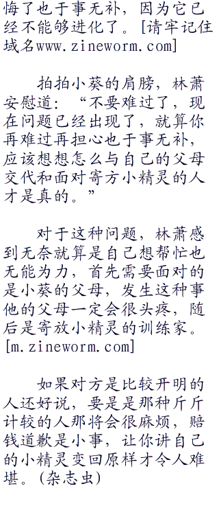 小葵越想越委屈,最后忍不住大哭了起来,有些东西不是一个十多岁的孩子能够承担下来的,别说是小葵就算是她的父母这个时候估计都会感到头疼,谁都没想到会发生这种事,让寄放的小精灵进化了,搞不好要赔钱的。