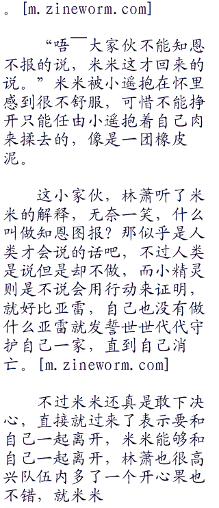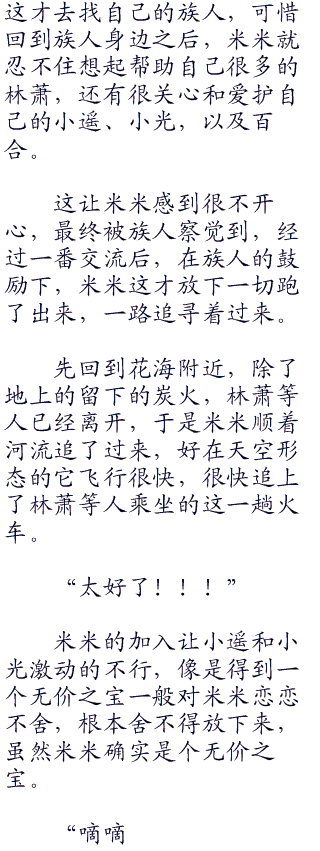 因为环境的原因,河边两岸上生活着不少的小精灵很多都还是成群结队的,种种的一切都能够让小光和小遥激动的大喊起来,对于小光和小遥这种孩子心性,林萧和百合只能相对无言以笑。
