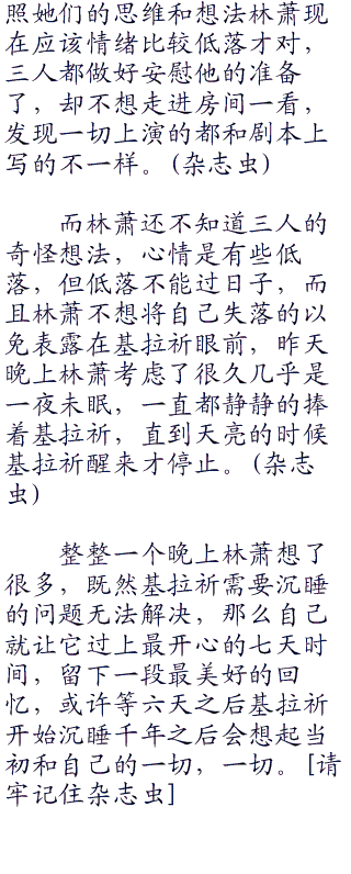 因为林萧的问题,小遥三人冷静下来后嘴上说没事,但心里却一直很在意,滚了很久才睡着。
