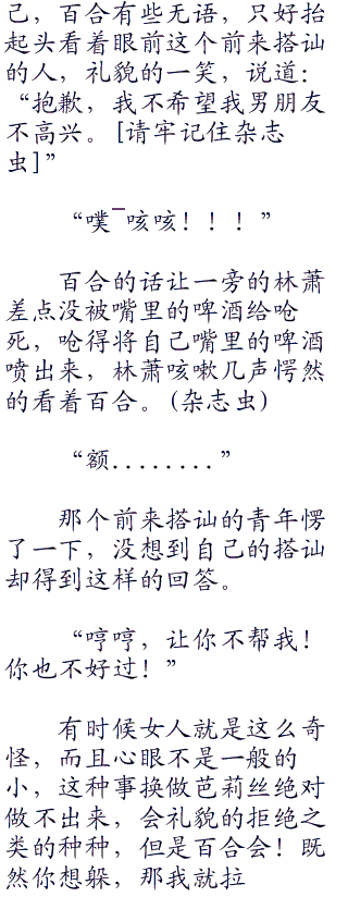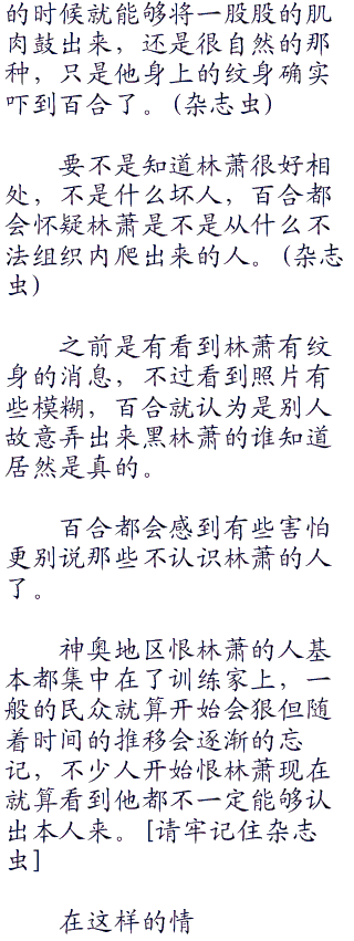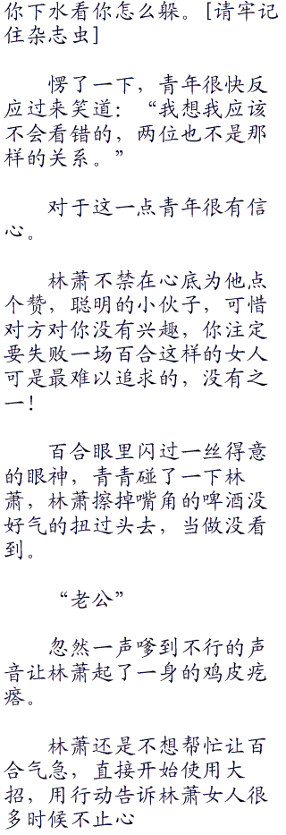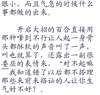 百合笑着摇摇头,将自己的秀发挽到耳后,百合的头发平时都盘着的,只有在休息的时候才会散开来,此时披散着头发的百合身上散发着一股特殊的气息。