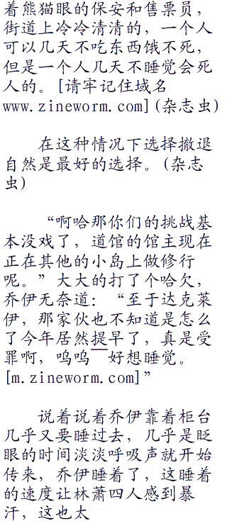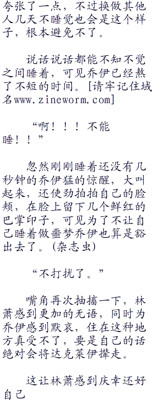 乔伊大大的打了个哈欠,无精打采的,尽管知道这样很不礼貌,但她也没办法改变什么,已经好几天没有睡觉了,困得不行,想睡又不敢睡,只要你进入梦
