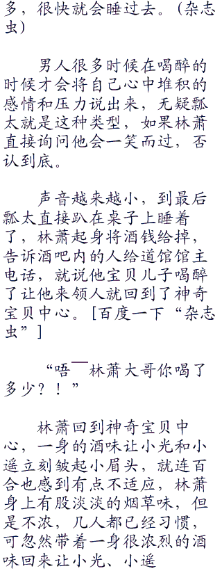 “呵呵~是么。”瓢太的眼里闪过一丝伤痛,狠狠的灌下几口啤酒,林萧静静的喝着酒,没有说话,如果瓢太愿意说的话就会告诉自己,如果自己追问搞不好还会让瓢太想多觉得自己是在看他的笑话。