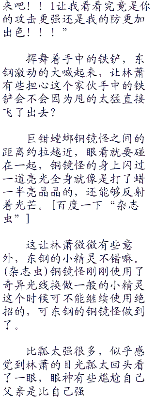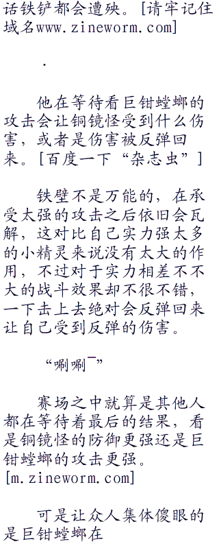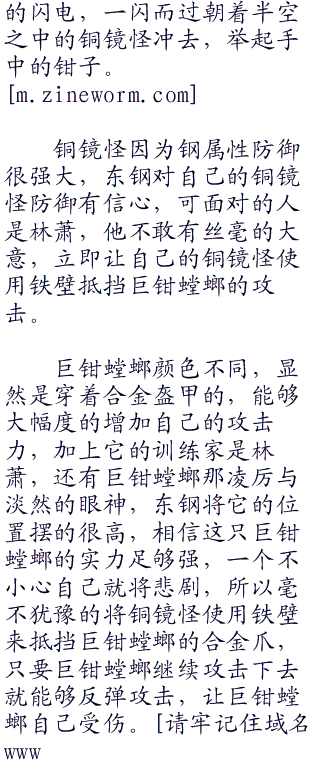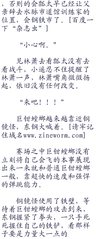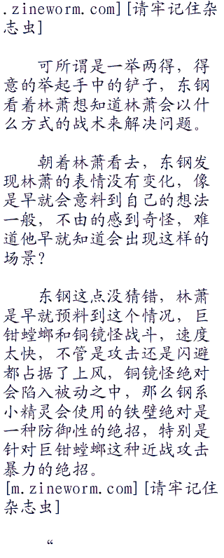 好在逃避不能一直持续下去,否则裁判会有意见的,这一点让东钢比较安心,否则林萧只需要让巨钳螳螂一直到处跑就已经足够,除非是使用一些战术将巨钳螳螂骗过去,可是想欺骗巨钳螳螂就等于是要欺骗过林萧,想欺骗过林萧可不容易。