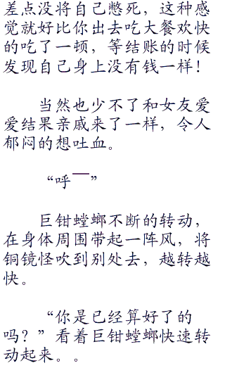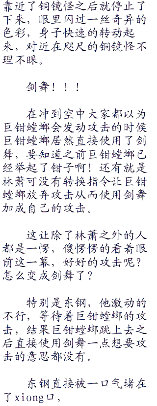 这样的速度已经可以让巨钳螳螂处于不败之地了,除了一些特别的绝招你攻击到它,你的绝招它都能够给避开来,让你看着急死。