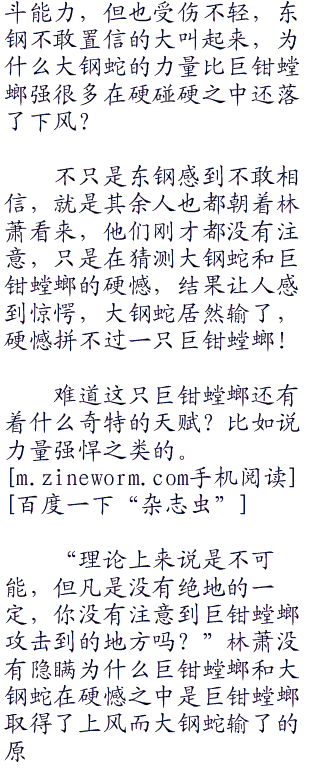 响起那个时候自己居然让巨钳螳螂敲大钢蛇的头还将大钢蛇敲得不得不选择大爆炸,林萧还有些觉得自己那时候很意气用事,换做现在的他绝对不会做出这种傻兮兮的举动来。