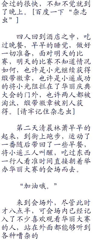 乌拉拉被君沙带走了,围起来看戏的众人这才慢慢的散去,小光和小遥很快将心中的不愉快都抛出脑外,继续训练起来,明天早上九点就是华丽大赛开始的时间,需要在这短短的一天时间内做努力才行,就算不能变强起码可以调整一下小精灵的们的状态。