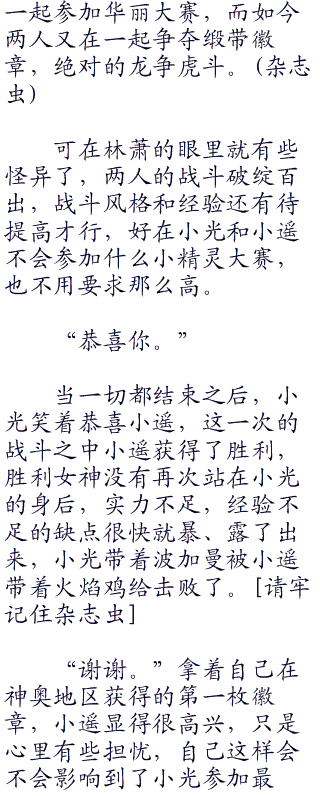 “我们又碰在一起咯,我不会手下留情的小光!!!”拿出精灵球,小遥满脸严肃,前两次的失利,让小遥感叹自己的运气有些不好,可运气不会一直跟随者小光,这一次自己一定会获得胜利的。