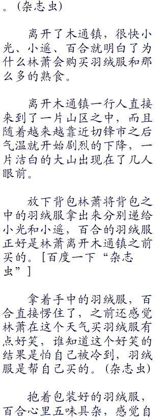 给过钱,林萧直接将羽绒服带上,顺便来到隔壁的超市内买了不少的熟食,这让小遥三人感到更加的奇怪了,这些已经煮熟的肉不能放置多久,否则就会坏掉。
