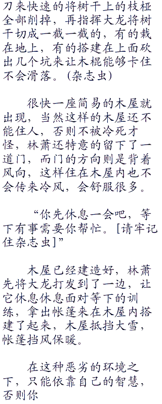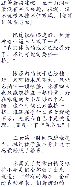 见此林萧知道已经不能够再继续前进了,无疑大雪山内正在下着暴风雪,在这样的天气下行走,小光、小遥、百合坚持不住。