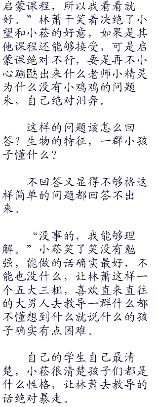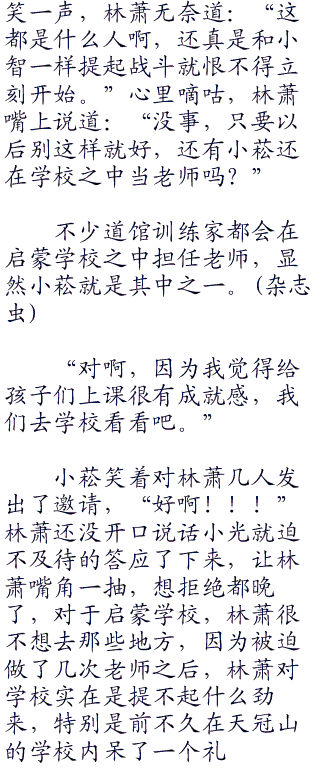 自我介绍之后,小菘自己跳了上来,盯着林萧打转,看的林萧心里直发毛,这人想干嘛?