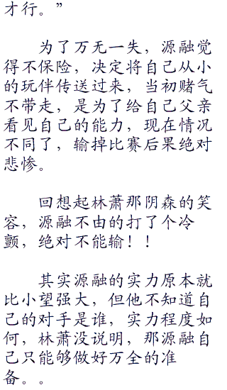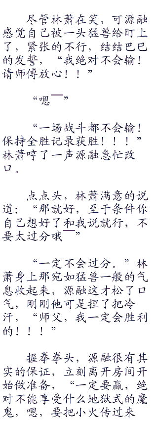 开始源融很是反对,但反对无效,无奈之下,源融只好去找科拿,希望科拿可以帮助自己求情,谁知道科拿确实求情了,由自己来教导,可短短三天实践之后,被科拿折腾怕了的源融乖乖的回道柳伯和夏伯身边,老老实实的训练。