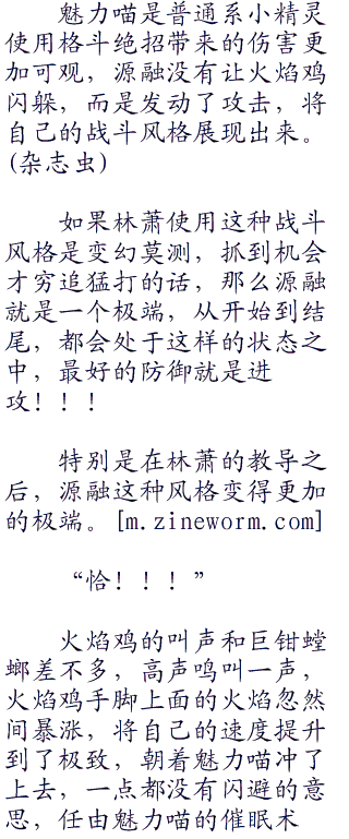 源融选择了更换小精灵,老裁判举起手大声喊道:“那么火焰鸡对战魅力喵,战斗正式开始!!!”