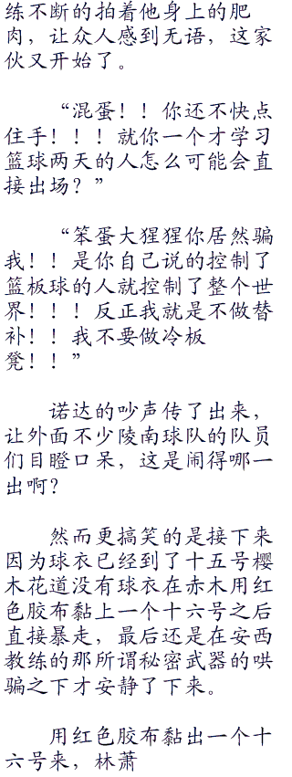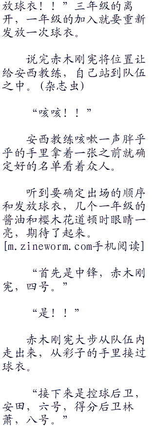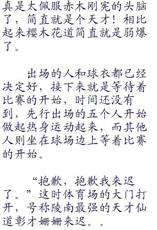 “哦呵呵”安西教练见赤木刚宪和鱼住纯之间蹦出了火花,发出一阵独特的笑声说道:“现在大家先去换衣服吧,比赛就要开始啦。”