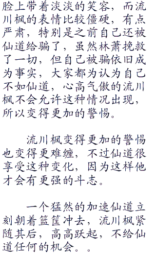 球场边长彩子和众多板凳球员们忍不住叹了口气,没想到仙道拉出来一副单打的架势,却在这个时候传球,而流川枫则是明显的上了当。