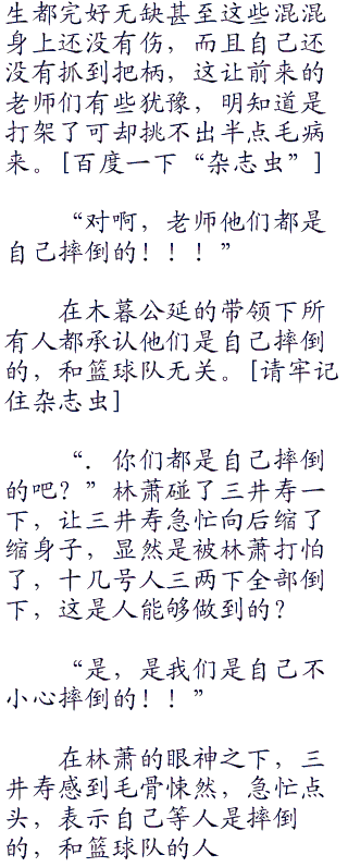 抓住三井寿的头发林萧狠狠的将他摔在地面上,让三井寿脑袋一阵发蒙五脏六腑翻江倒海,直接趴在了地上没有了反应。