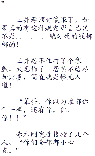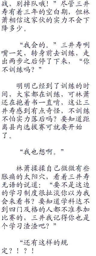 “教练。”最先看不下去的是心肠比较软的彩子和木暮公延,在他们两个的带头之下,其他人都向安西教练求情,只有流川枫、林萧、樱木花道、赤木刚宪沉默不语。