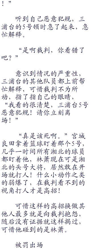 整个球场内一片寂静,所有人都没有发出声音,湘北开场就一记令人措手不及的灌篮开场,让现场的观众们有些愣神,是湘北的实力太强还是运气好,趁着三浦台球员都没有回过神来的时候完成的灌篮?