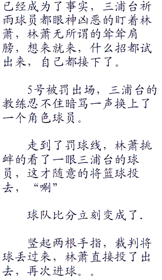 “碰~碰~”篮球落下来在地板上弹了几下,林萧从球架上下来,平静的回到了自己的半场,没有发出怒吼和示威,因为根本不需要,三浦台还没有那样的实力。