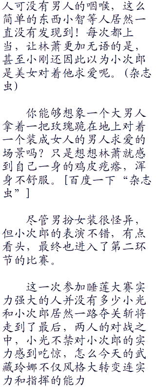 先不说男人的皮肤比较粗糙,骨架大,就算你装得很像可有些东西你根本无法改变啊,那就是咽喉,女