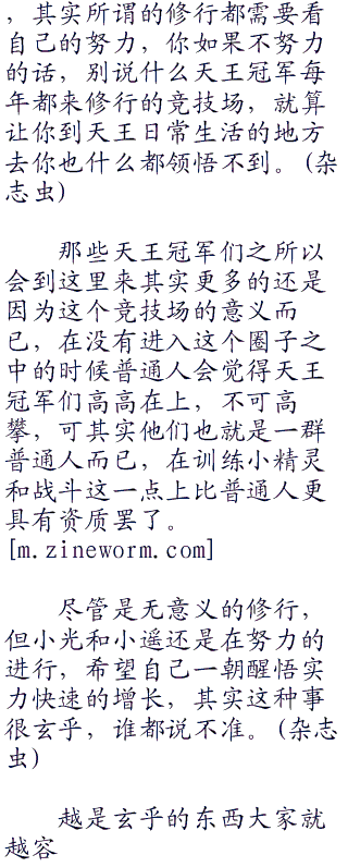 小光欢快的将自己的小精灵全部放而来出来,准备和那些来到这里的训练家一样做着修行,看了看小光小遥也将自己的小精灵全部放了出来,林萧只是简单的放出来几只需要训练的小精灵没有全部,竞技场因为是很久以前修建的观众席很大,但是赛场却很小,容纳不下那么多的小精灵一起训练。