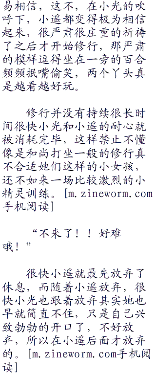 给小精灵们下达了一些训练任务,林萧开始在竞技场内走动观察起来,无所事事的百合坐在一边望着小光和小遥修行,看着两个丫头明明什么都不懂却要做出一副深沉的样子忍不住笑了起来。