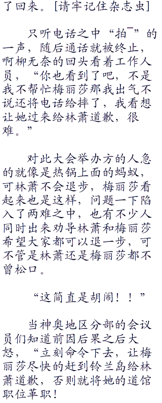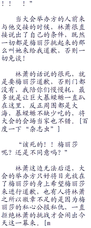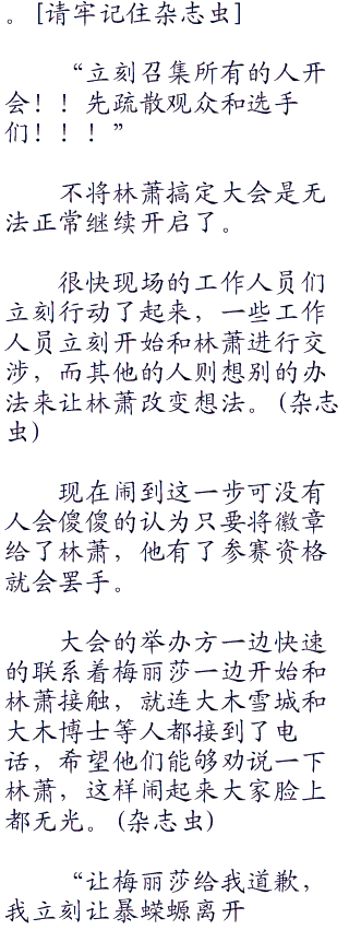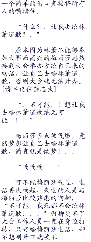 难怪之前透过监控看到林萧不断的询问乔伊“真的不能?!”感情就是为了这一刻,我不能参加比赛,你们也别想继续举办了,看谁熬得过谁!