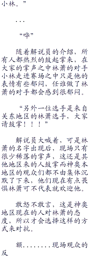 比赛推迟了一天继续进行,让那些提起心的观众和参赛选手们都松了口气,除了霸占赛场不准参加比赛之后,林萧也没有做出太多激动的举动,这让神奥地区很多人都安心不少。