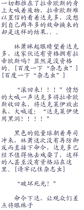 “狂妄吗?或许吧,那么我就让你见识一下什么是狂妄,回来吧帕路奇犽!”拿出精灵球林萧将帕路奇犽收了起来,看起来这个家伙还有那么一点自信心,那么也好我就让你见识一下什么是狂妄什么是绝望!!