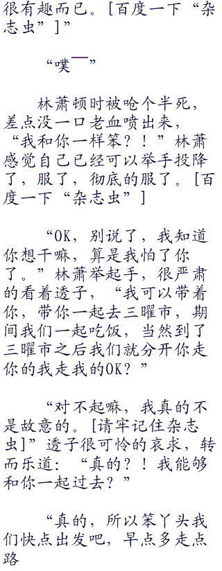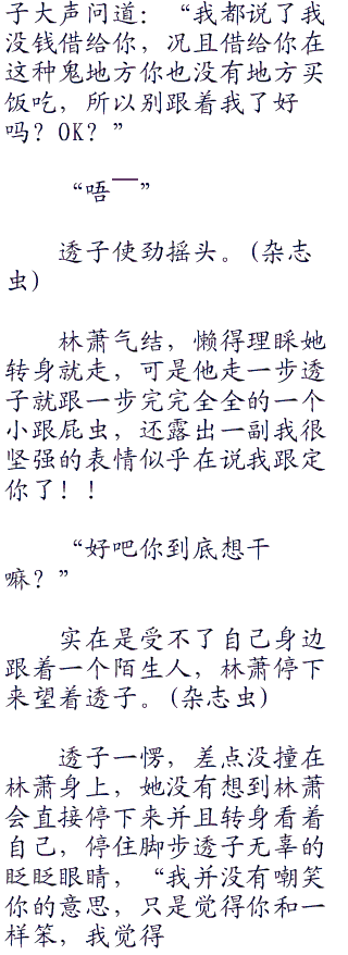 “哈哈哈,笑死我了,没想到我笨你比我还笨!!哈哈哈,好搞笑。”透子大笑着抱着肚子在草地上滚了起来,眼角狠狠抽搐了一下,林萧闭上眼睛深吸一口气在心底对自己说:“就原谅这个无知的孩子吧。”