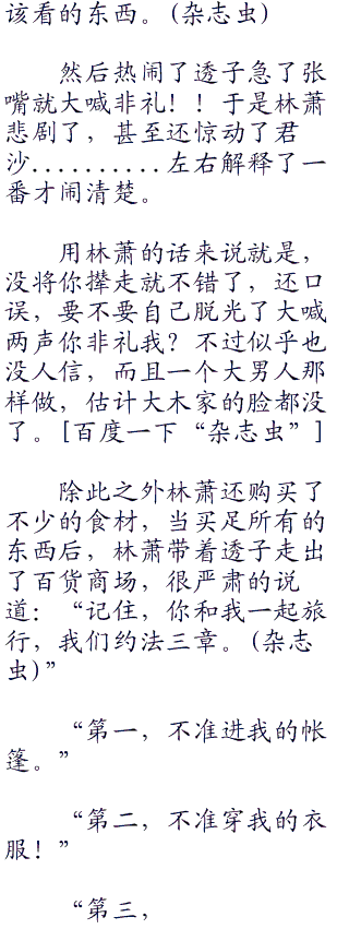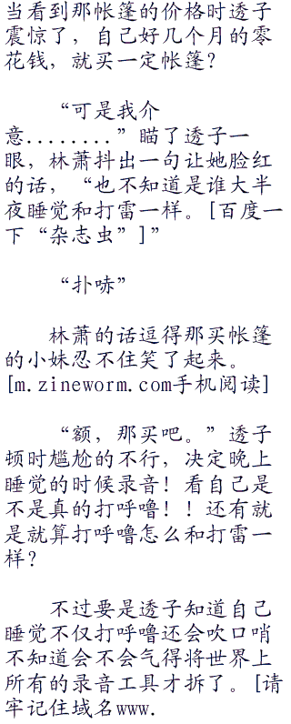 走进百货商场内,林萧先买了一顶帐篷,当透子看到那高额的价格后吓得叫了起来,“我们快走,我不要帐篷了我和你挤一挤就可以了,我不介意的!!”