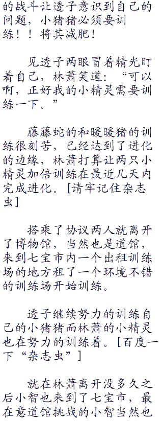 倒不是两人吃饭那么慢是因为透子的小猪猪,林萧弄下来的训练内容,藤藤蛇不到半个小时就已经结束了,暖暖猪比较快,用了一个小时,而黑眼鳄比较慢也用了一个多小时就抵达了,只有透子的小猪猪,令人崩溃的是这么一点距离用了四个小时的时间才结束!!