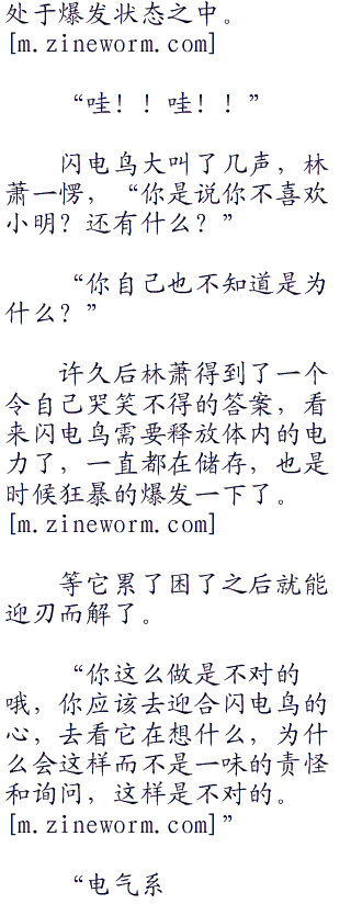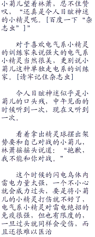 给透子弄了一份吃的,吃过之后林萧来到医院的地下训练场开始训练小精灵,更多的还是教育闪电鸟这家伙。