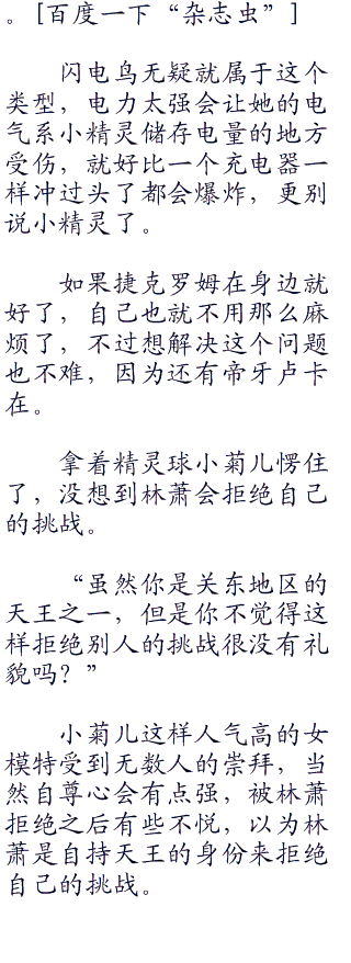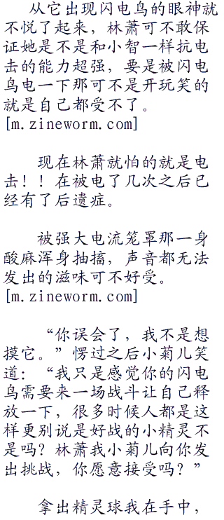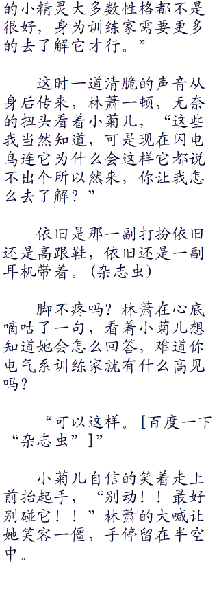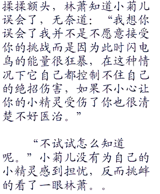 抛出精灵球让其他几只小精灵自己训练,林萧看着闪电鸟,闪电鸟将脑袋低下很是心虚。