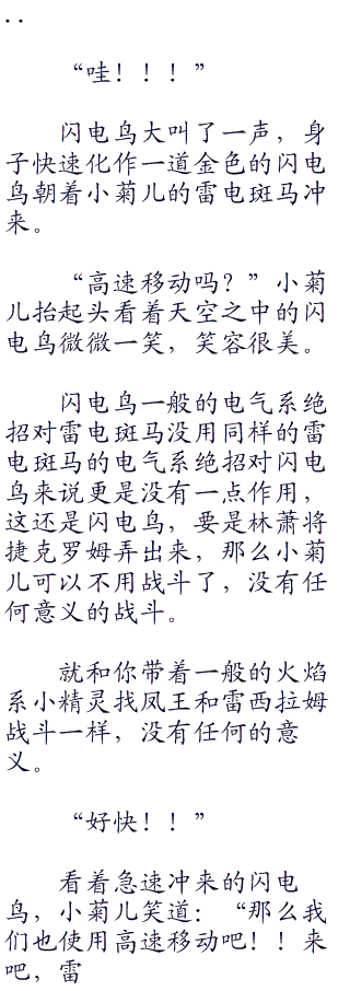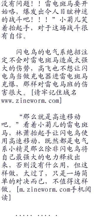 虽然在资料之中显示,小菊儿的实力很不错,可高飞并不是很看好她和自己的闪电鸟对战,搞不好的话小精灵受伤会很严重。